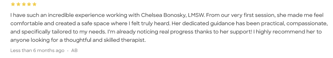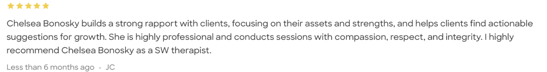 My name is Chelsea Bonosky, and I am a practicing psychotherapist, earning my Master’s degree in Social Work from Fordham University’s Graduate School of Social Service, with a Specialized Practice Certificate in Crisis and Resilience.