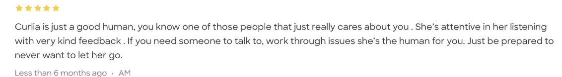 Are you feeling stuck, anxious, or weighed down by life’s challenges? You’re not alone — and you don’t have to face it alone. I’m Curlia, a compassionate therapist dedicated to helping adults find clarity, confidence, and emotional balance.