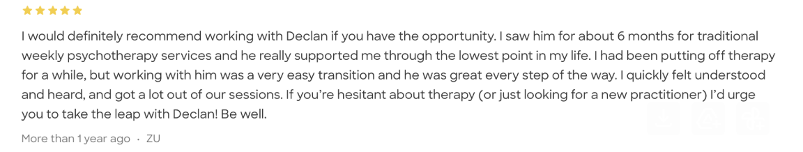 Before becoming a therapist, I worked for ten years in the music and book publishing industries. Having a career and switching careers, has allowed me to work with people from a wide variety of backgrounds. Together, we can identify problems and create goals. I am happy to offer a free phone consultation to see if we would be a good fit.